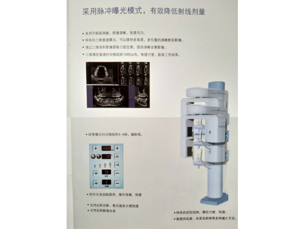 采用脈沖曝光模式,有效降低射線劑量采用平板探測器,圖像清晰,亮度均勻。特有的三維重建算法,可以提供多角度,多位置的清晰斷