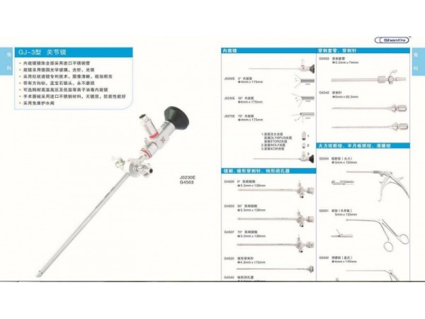 型號 名稱 數量 單位8880.543 PANOVIEW PLUS內窺鏡,30度視角,直徑4mm,工作長度175mm 1 根8885.031 鏡鞘,直徑5.6mm,能自動閉合,2灌洗通道 1 根8885,11 棱形錐 1 根8885.121 閉孔器 1 根8302.09 引流管,一個開關,內徑2.3mm,直徑3.2mm,工作長度80mm 1 根8302.101 斜頭穿刺鞘,直徑2.3mm,工作長度103mm 1 根8399.95 探鉤,直徑2.5mm,工作長度115mm,帶刻度 1 根8404.017 活檢鉗,左90度彎,外鞘直徑3.4 mm,工作長度130mm 1 把8404.018 活檢鉗,右90度彎,外鞘直徑3.4mm,工作長度130mm 1 把8488.951 咬鉗,直鏟形,直徑3.4mm,工作長度130mm 1 把8488.063 咬鉗,鋸齒狀鉗嘴,前部15度向上成角,直徑3.4mm,工作長度130mm 1 把8488.025 咬鉗,前部15度向上成角,直徑3.4mm,工作長度130mm 1 把8488.04 鉤狀剪刀,直形,直徑3.4mm,工作長度130mm 1 把8403.1 活檢/取出鉗,帶釘齒,對開,直徑4.5mm,工作長度130mm 1 把8403.001 O’Conner半月板鉗,直徑4/7mm,工作長度105mm 1 把8436.101 直手術刀,工作長度125mm 1 把8436.201 鉤狀刀,工作長度125mm 1 把8436.251 香蕉狀刀,工作長度125mm 1 把8436.301 直關節刀,工作長度125mm 1 把8211.661 mini型反向咬切鉗鉗頭,可旋轉,工作長度110mm 1 個8211.601 mini咬切鉗手柄 1 個 刨削系統 型號 名稱 數量 單位2303.001 刨削動力系統POWER CONTROL 2303,含有:腳踏開關 1 臺8564.121 動力刨削手柄,M4,最高轉速6000轉 1 個8568.011 切割刀頭,齒狀,直徑4.5mm,工作長度126.5mm 1 根8568.031 切割刀頭,卵圓形,刀片,直徑4.5mm,工作長度126.5mm 1 根8568.051 切割刀頭,內外帶齒,直徑4.5mm,工作長度126.5mm 1 根8568.201 切割刀頭,刀片,直徑4.5mm,工作長度126.5mm 1 根8569.301 切割刀頭,圓頭,直徑5.5mm,工作長度126.5mm 1 根