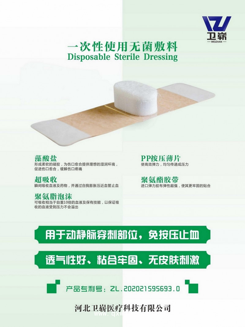 主要適用于供手術、外傷創面(mian)或留置動(dong)(dong)(dong)、靜脈(mo)導管貼敷(fu)用和嬰兒臍帶創面(mian)保(bao)護。廣泛(fan)用于動(dong)(dong)(dong)脈(mo)穿(chuan)刺術后、動(dong)(dong)(dong)脈(mo)采血及(ji)動(dong)(dong)(dong)脈(mo)造影、透析等術后動(dong)(dong)(dong)脈(mo)穿(chuan)刺點(dian)止血或PICC導管穿(chuan)刺點(dian)止血。