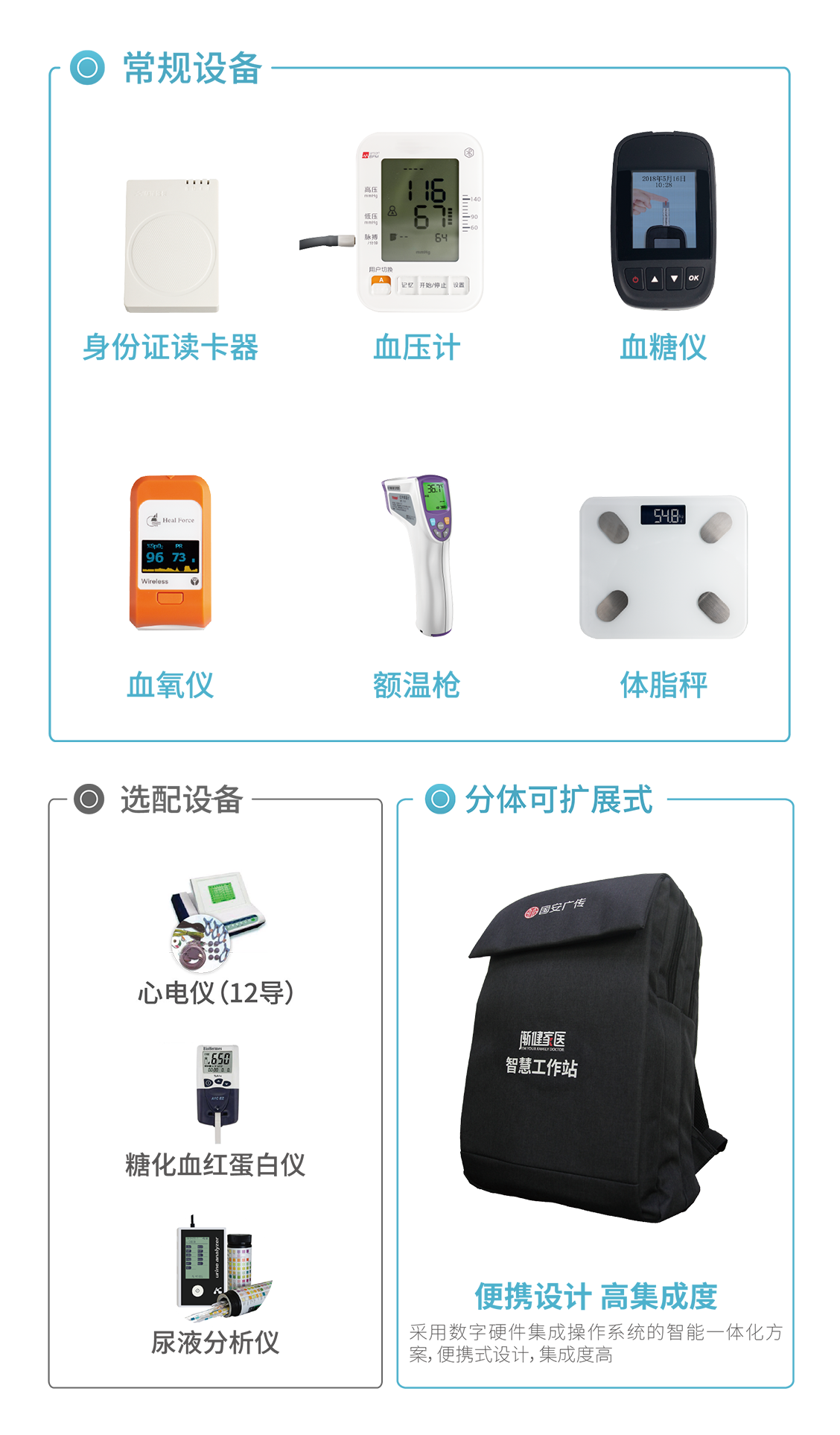 漸健家醫家庭醫生簽約隨訪工作站_智能隨訪包_公共衛生體檢隨訪包_家庭醫生簽約隨訪包_財政貼息_基層賦能_健康老齡化項目采用數字硬件集成操作系統的智能一體化方案,便攜式設計,集成度高,成品形態支持分體可擴展式或一體集成式,適用于家庭醫生針對轄區居民開展規范化、全周期的各類健康服務場景。
