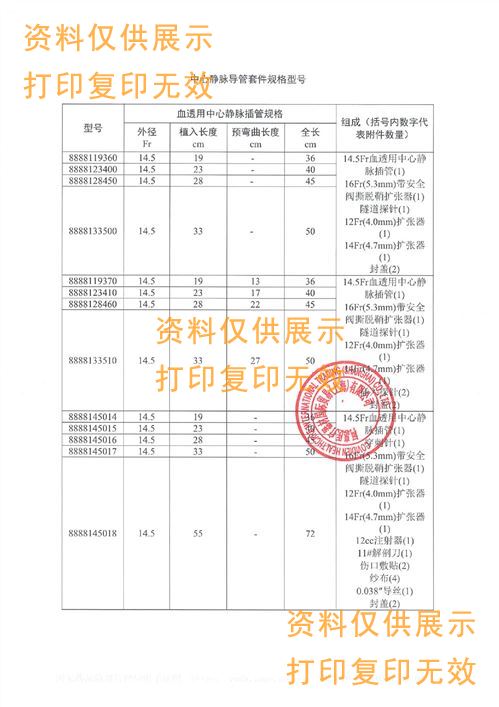 ? ? ?本產品包括:血透用中心靜脈插管、導絲、擴張器、穿刺針、隧道探針、傷口敷貼、注射器、封蓋、解剖刀等。血透用中心靜脈插管管體采用聚氨酯制成:導絲和穿刺針由304不銹鋼制成,隧道探針由303不銹鋼制成:擴張器采用高密度聚乙烯材料:傷口敷貼由聚酯薄膜和棉線制成。產品為一次性使用,環氧乙烷滅菌。留置中心靜脈后可持久使用(可大于30天)。