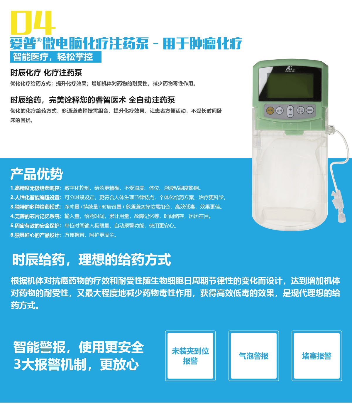 【產品類別】其他【批準文號】國械注準20173141272【招商區域】全國【產品賣點】獨特的多種給藥模式:靜沖量+持續量+時辰設置+多通道選擇按需組合,高效低毒,效果更佳【產品說明】產品特點:時辰給藥人性化智能編程設置:可分時段設定,更符合人體生理節律特點,個體化給藥方案,治療更科學。優化的勻速持續給