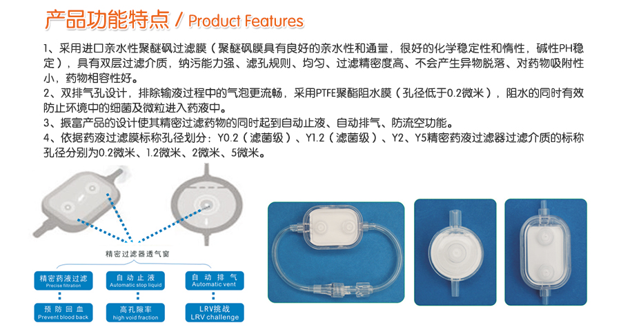 【產品名稱】【產品類別】其他【招商區域】【產品說明】產品特點1.精密藥業過濾2.自動止液3.自動排氣4.預防回血5.高空隙率 產品優勢1.采用進口親水性聚醚砜過濾膜,具有雙層過濾介質,